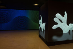 What comes first, day or night? There is no right answer. They are eternally consecutive, as are the elements displayed in the two rooms. A wall painting of a wave breaks through both spaces. First, we find a series of coral-shaped wooden sculptures, leading us on to the obscurity of the ocean’s depths.